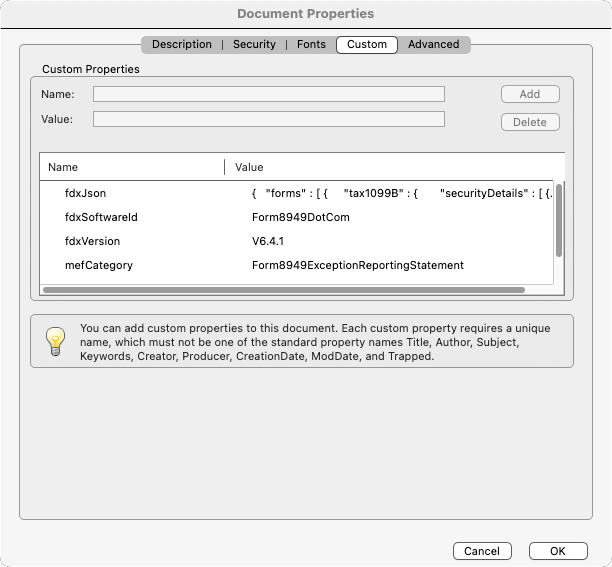 "Intelligent" Form 8949 Statements include the statement data in the document properties in industry-standard JSON (Java Script Object Notation) format.