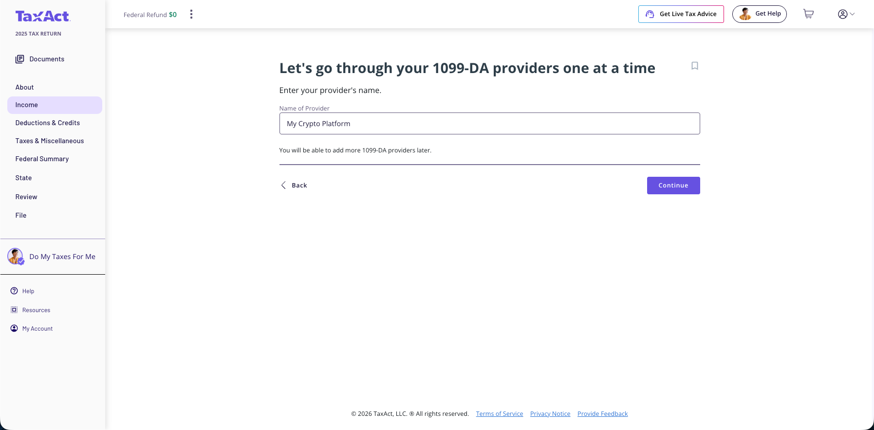 On the next screen, Enter the name of your 1099-DA provider and Click 'Continue'