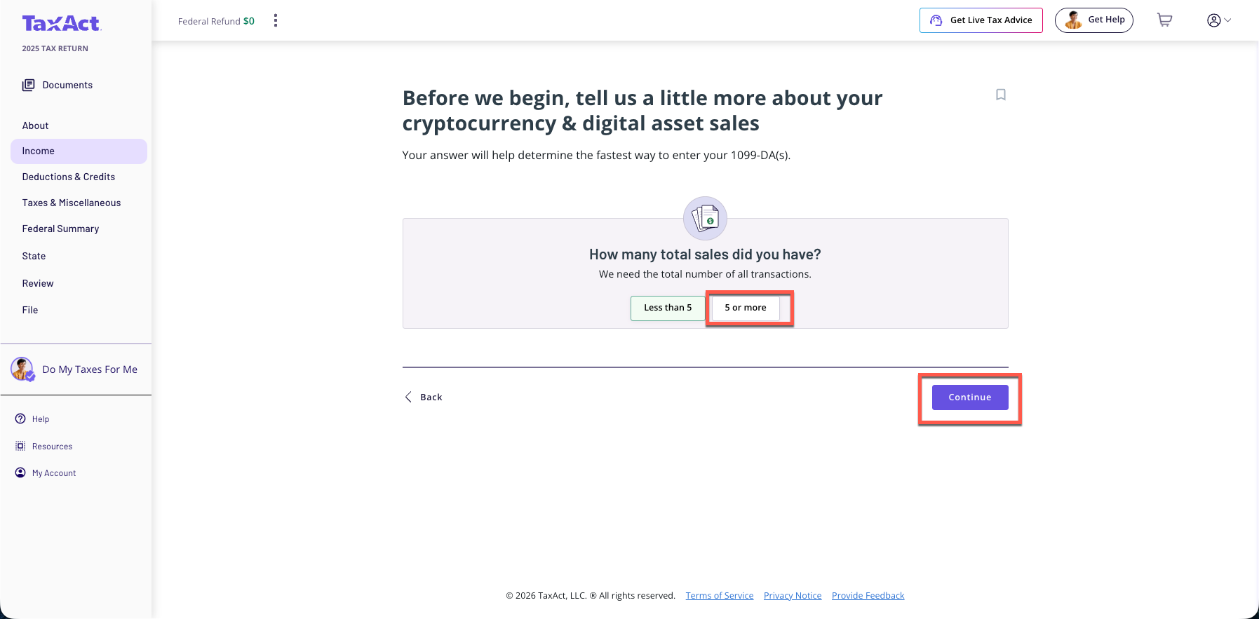 You will receive Form 1099-DA when you sell, exchange, or otherwise dispose of a digital asset. There are several options that you can use to enter transactions and information from Form 1099-DA. Once entered, the TaxAct program will complete Form 8949, Schedule D Capital Gains and Losses, and Form 1040, as applicable.