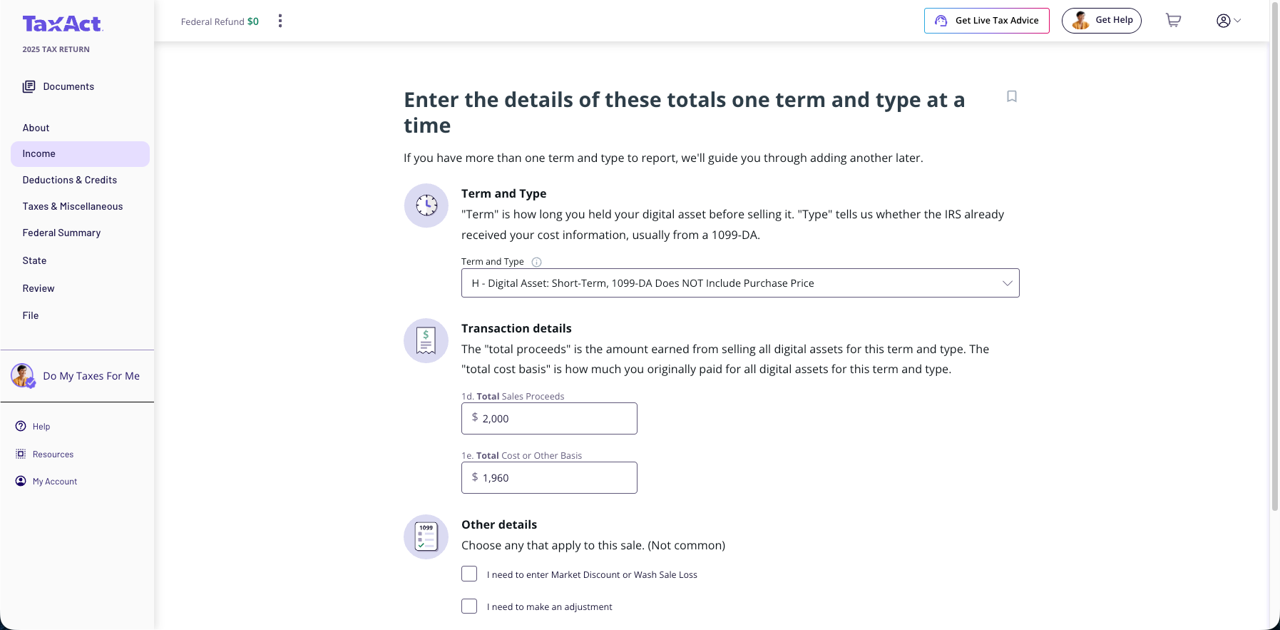 Form 1099-DA - Entering Transactions