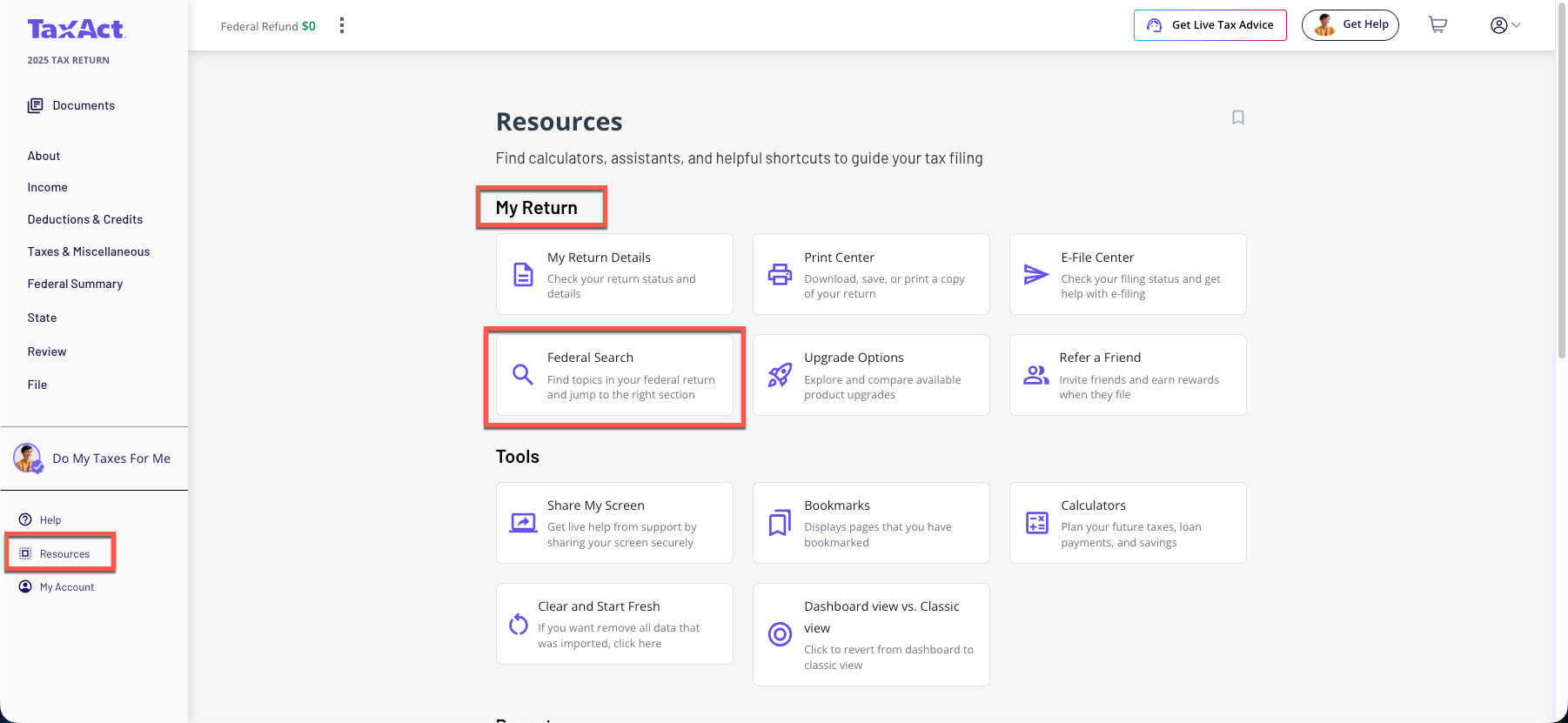 From within your TaxAct return, click Resources.