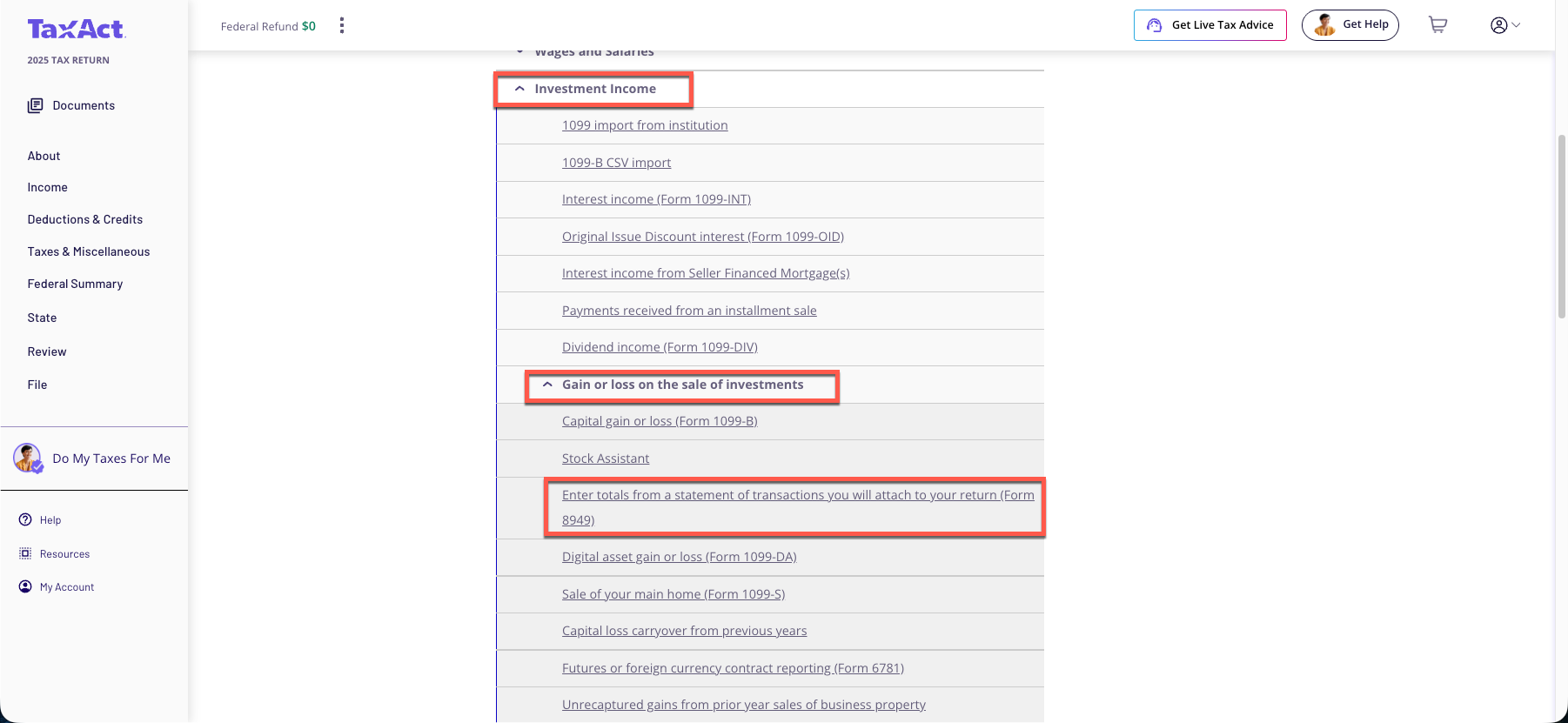 Click the Investment Income drop-down, and then click Gain or loss on the sale of investments and then Enter totals from a statement of transactions you will attach to your return.